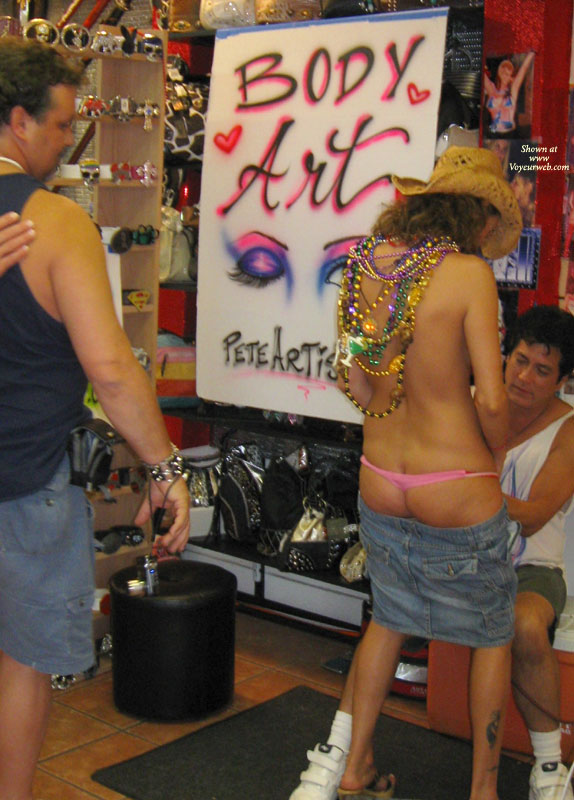 It is hard to take good pictures in paint booths during Fantasy Fest. The girls usually stand with their backs to the public, facing the painter, so its hard to get a good frontal shot. There are usually lights against the wall of the booth to light the subject for the painter, so most camera shots are like shooting into the sun - not good. And the girls are more photo shy when getting painted than they are after leaving the booth and spending time walking around in public. So as a rule, paint booth pictures are tough. But rules are made to be broken, and this cowgirl posed for some very good pictures. She was not photo shy, and was happy to pose for pictures while showing off her new paint job.The contri starts with cowgirl in the paint booth, facing the painter, with her back to the gawkers, myself included. I wanted a picture of her front so I hung over a counter and aimed my camera at her from between 2 shelves. I was wondering if she would be peeved by my gymnastic antics, but by her expression you can see that she was amused by my efforts and enjoying herself, probably aware of how much of a tease it was for us to watch her from behind.BTW the title of the contri is inspired by the Brooks and Dunn song Cowgirls Dont Cry...