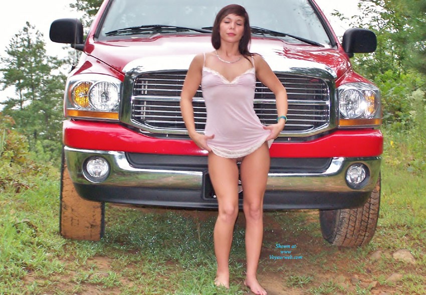 Dared her dress sexxy and let me take some public pics for my B'day! She agreed but she got to pick the spot, we drove out on dirt road that had some construction equipment but it being Saturday and couldn't see anyone so she gets out 5 mins. into it with the radio we didnt hear the truck pull up! 6 workers get feet from us my wife in see tru top & panties she started to run they started cheering & begging her to keep going I take couple of pics that makes her stop she walked back & said Happy B'Day!!