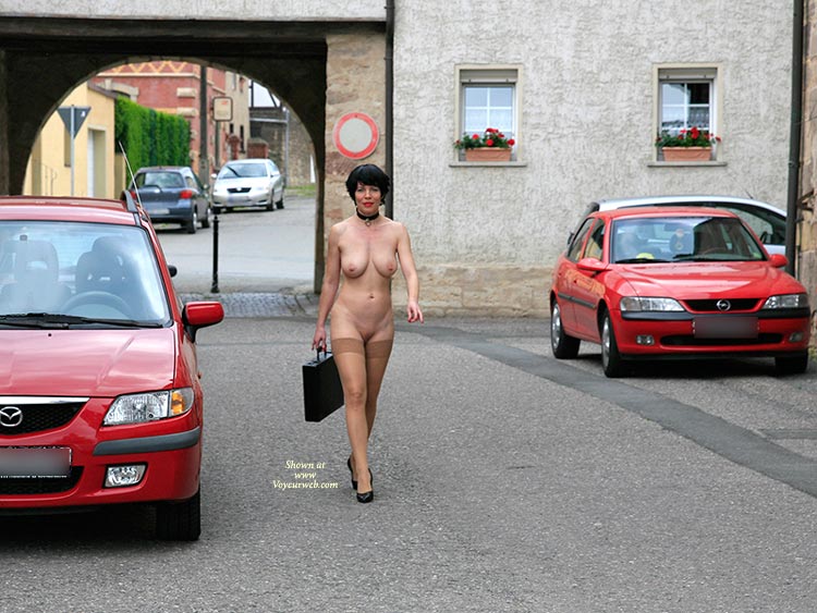 Julia dropped here cloth into the container so she had to walk bud naked back to the car. Not sure the guy who waved had any idea what was going on. Ihren Weg zurück zum Auto musste Julia splitternackt antreten. Der Herr im Hintergrund traute jedenfalls seinen Augen nicht was er da zu sehen bekam.