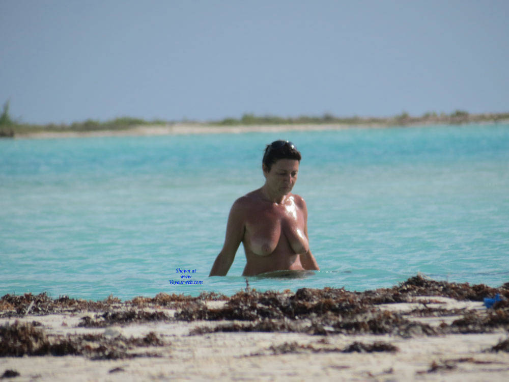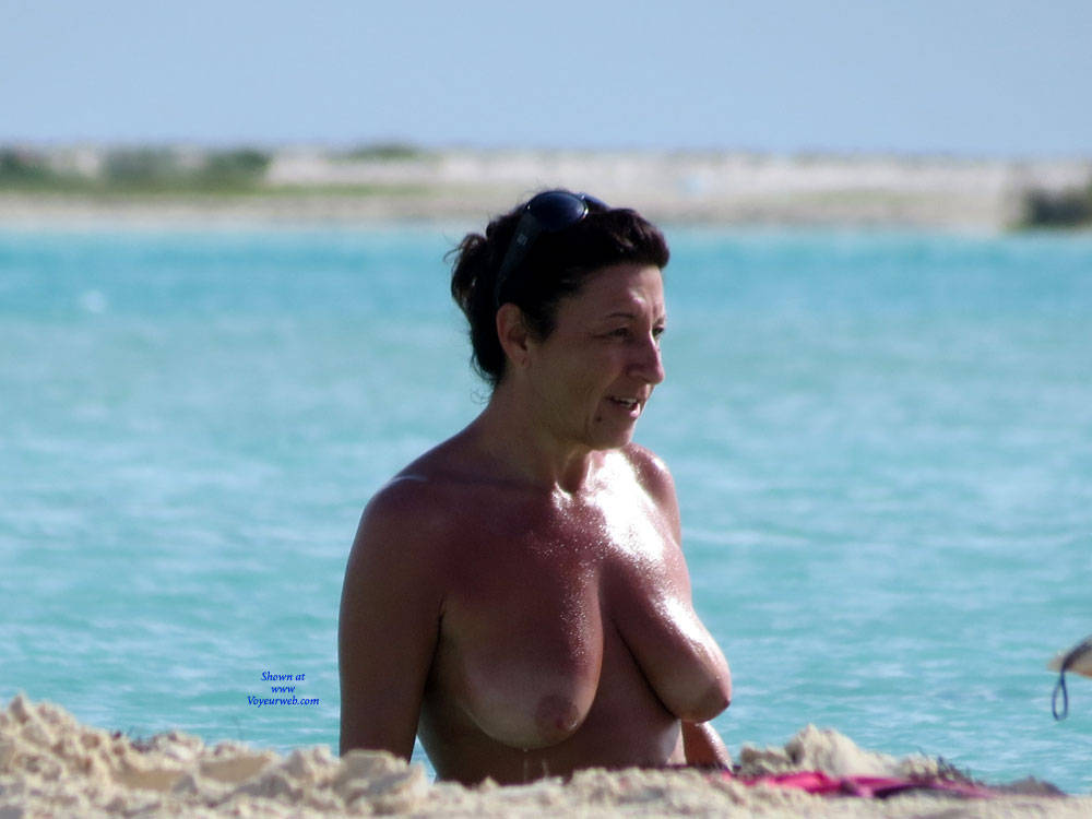 A fun day at the beach, a very confident milf casually enjoying the water and sun while exposing her soft natural hanging breasts.