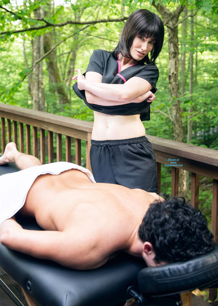 This session was so much fun! The idea actually came from Eitan's list of fantasies to create He brought the props : my scrubs, massage table, borrowed towel from the cabin we were staying at. Cowan picked the perfect shooting spot out on the balcony with the gorgeous nature all around us. All I had to do was play along as Head Masseuse! I hope you thoroughly enjoy yourselves as much as we did @BreeOClaire -So, without any further ado …  Hello (Mr. Eitan), I'm Bree... I'll be working on your kinks today...