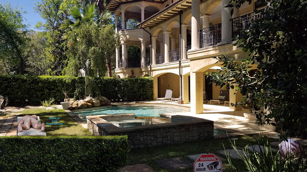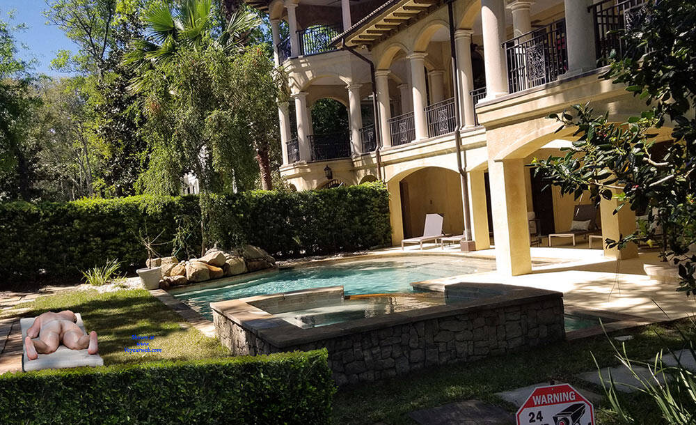 I was recently backing up my 2019 photos from my phone and discovered a lucky catch that I was unaware of at the time.  I had a conference last April on Hilton Head Island and stayed at the Marriott right on Hilton Head Beach.  One morning I took a walk along the ocean front, walking along the coast in front of what has to be multi-million dollar properties. About 40 minutes into the walk, the morning haze began to burn off as the sun became high over head and the temperature really started to rise.  I decided I would take the next walkway that cut between the properties to the street and walk back to the hotel under the tree canopy lining the street just to get some shade. When I came to the next pathway, it was under construction so I continued on.  As I got to the next path, there was tape indicating that it too, was under construction, but I could see that they had not yet begun to tear it out.  So I ducked under the tape and made my way the few hundred yards toward the street.  The walkway was lined on both sides with a very thick hedgerow giving a good level of privacy to the homeowners.  As I walked I could sense the enormity of these homes and their gorgeous backyards, so when I had an opportunity, I reached my camera over the hedges and snapped a couple of pictures to see what the backyards looked like. I took a few pictures and quickly looked at them on my phone, with the bright sun I could see the pictures, but the glare prevented me from seeing any details.  I walked back to the hotel and quickly forgot about the pictures. So you can imagine my surprise when I was backing up my phone pictures onto my home computer with a much larger screen and discovered a nude sunbather in the corner of a couple of shots.  As a long time viewer (decades), but never contributor, I decided to share my finding with the voyeurweb community.  I've "enjoyed" these pictures a few times imaging the sunbather is the ultra rich home owner.