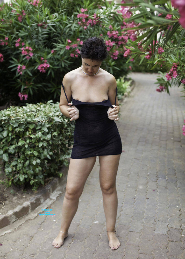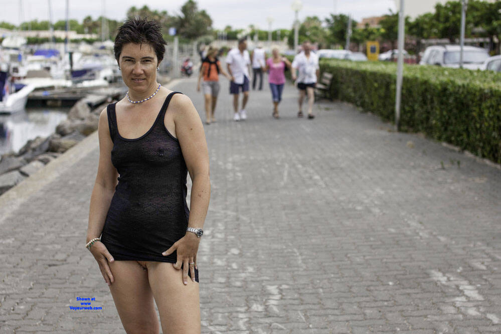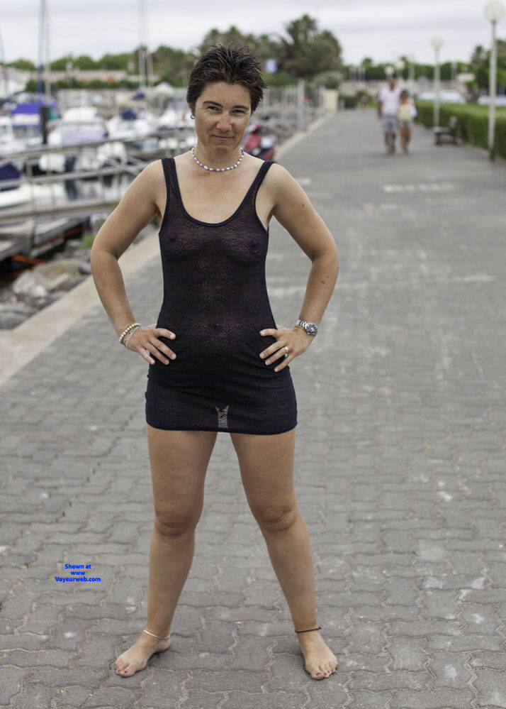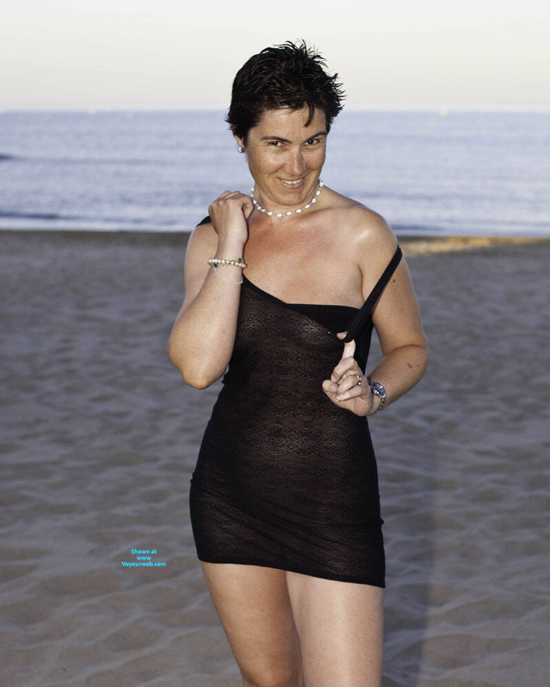 Every night when we go out on holiday, no matter where we happen to be in the world, Mike and I have lots of fun choosing what I'm going to wear. For this night it was a very simple little black dress with nothing underneath. I was feeling very sexy and carefree so I decided to go out barefoot as well. The dress was very transparent so we went to the beach first to take some test shots to get the camera settings right as it was already 9pm and the light was dropping. After that it was on for our customary stroll around the town to eat in an outdoor restaurant and to have some fun.