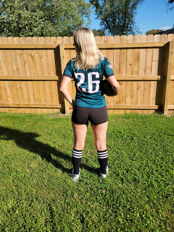 Wife poses in American football jersey for all of her mouthwatering football fans. She loves holding balls and really any ball will do when she is horny. Please enjoy her rooting for the Philadelphia Eagles!