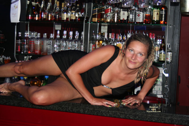 That was fun for us and viewers. O holidays we went to club in other town. She wore superb dress as you see. Late barmen said that he and his mate had a bet “Has she panties or no?” Barmen say “Yes”, his mate “No”. Poor barmen – he lost a bet. At first we had some cocktails and were talking wit him. Late asked “do we can make some photos?” He said “normally No. but tonight there is no many people. Let’s do”. He did’ not expected such show. At first we too. But “show must go on…” How do you think? If yes, vote and will be more.