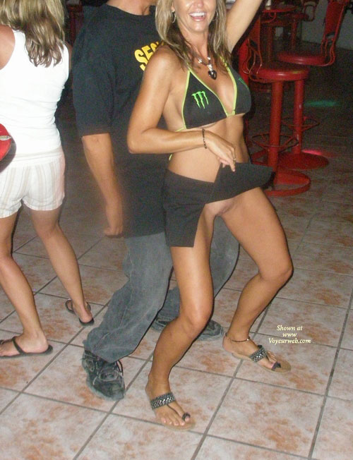 When on vacation in Puerto Penasco Mexico we found a great little bar called Coyote Ugly. Well, with bartop danceing encouraged I could help but take it to the extreame ;0) The security guards were so nice to let me "dance" on the bar so long as they could see under my skirt and were also nice enough to pose with me in the parking lot. There was alot of traffic just 10 feet from where the pictures were taken and a ton of whistels and screeming in Spanish that I couldnt understand. They also filmed video of a line of women lined up to do body shots off my tits. If you would like to see the clips of that , please let me know....Love you all!