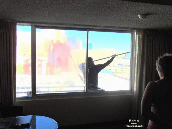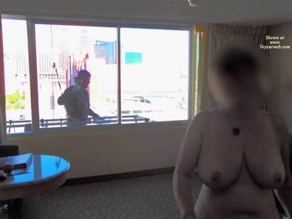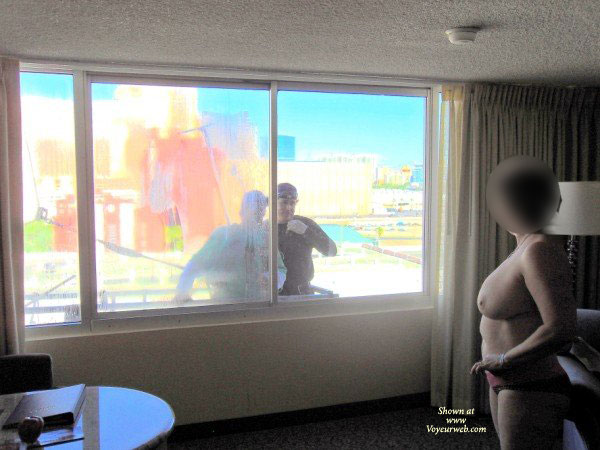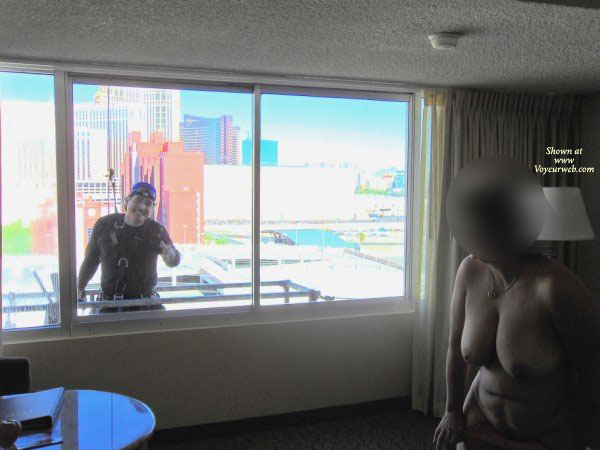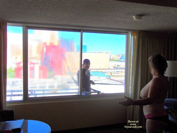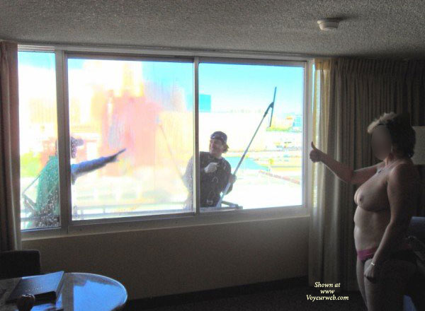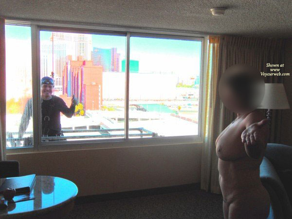 Wow, we had a rare window of opportunity on our vegas vacation. The window washers came down from above and my husband dared me to give them a show. I was pretty nervous but said what the heck this is vegas, and bravely came out in my underwear. I gave them a show, my husband got some pics and we made a great memory. We have enjoyed voyeurweb for some time now but have never felt we had a good contri. The window contest came up so we just had to break our cherry and send these in. Gotta love vegas!!