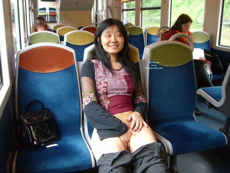 We were on the way by train to visit some family outside of Paris... and started to play with our camera. It started like a bet. "Are you crazy enough to show your pussy right now?" The train was not crowded by a few people was sitting close to us... and it was really very exciting to do this!On the way back to Paris, we tried again the same game and even did some more kinky pics and videos !This is our first contribution, we hope you will like it... Please tell us and we'll send many more...Cheers,Minji and Paul