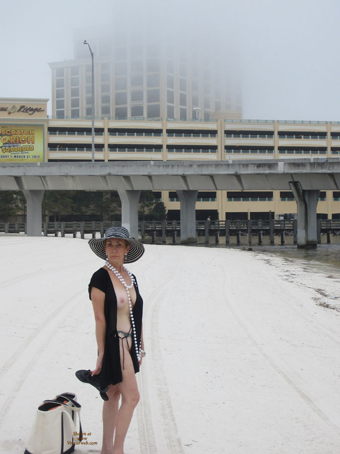 Finally on the beach. Cloudy; light fog shrouds the hotel.