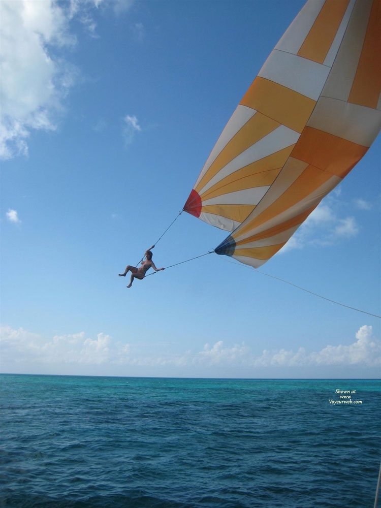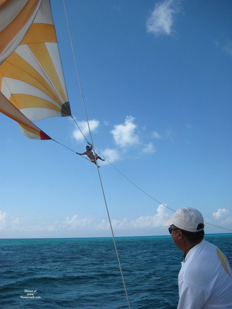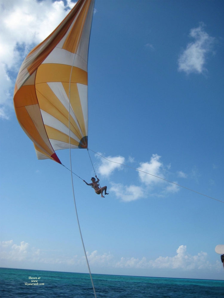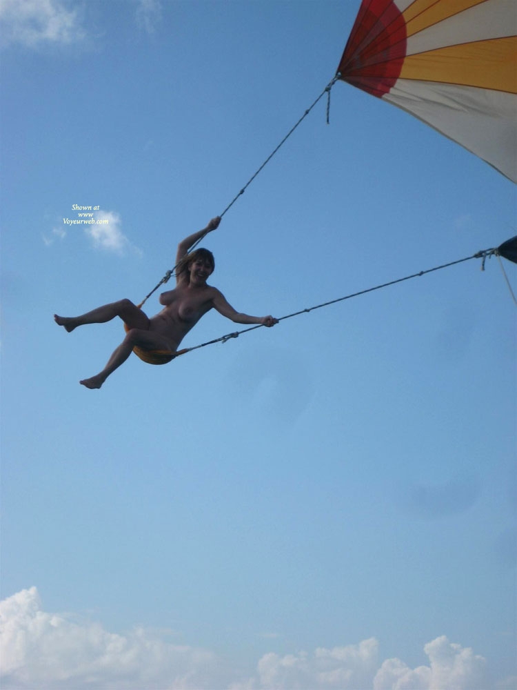 This was definitely outside her comfort zone. A good day on a boat consists of lots of a swim in the ocean, hehe, and of course being naked. On this day she went power sailing as the captain attached her to the jib sail. It was amazing to see her so high in the sky and so far away. BTW the captain really enoyed the view too! Hope we've captured the thrill of my wife as she braved beyond her expectations. Not bad for a 55 year old lady!!!! Love to read your comments!!!