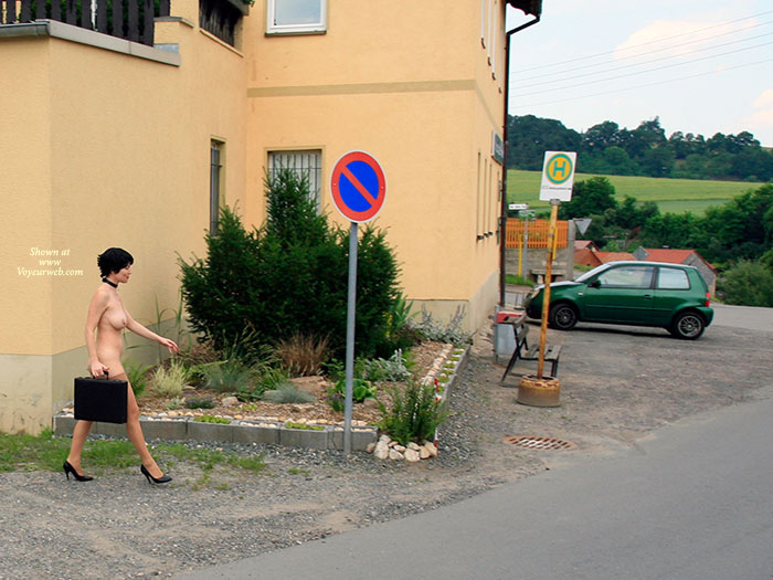 We parked the car at the central marketplace and Julia walked to the container to drop here clothes for charity. While having no more clothes she had to walk naked through town back to the car with no chance to cover.Wir parkten das Auto auf dem Marktplatz und Julia ging zu dem Altkleidercontainer. Dort angekommen warf Sie Ihr Kostüm in den Container. Nun konnte Sie nur noch nackt durch die Stadt zurück zum Auto gehen