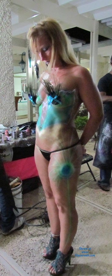 Our 1st trip to Hedonism II and on our 1st night, she got body painted to complete her Peacock themed pasties, G-string, earrings and hair extension! She got 2nd place in the contest - PLEASE vote SUPERB and help her win FIRST place!