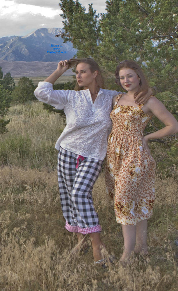 Two ladies cavorting in the woods showing their attributes for the camera.