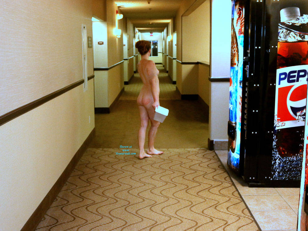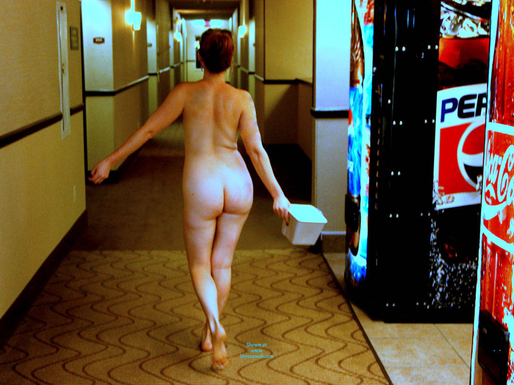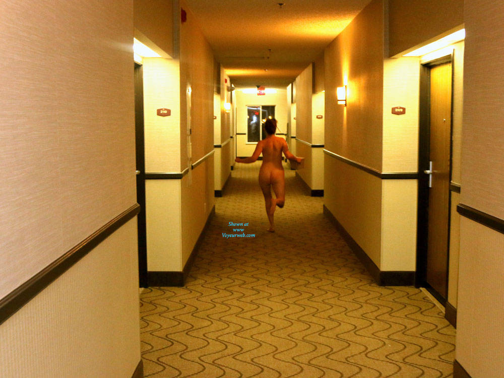 After shooting pics in the hotel suite, my friend with the camera dared me to run through the hallways totally bare-assed naked, first to the ice machine, then... he dared me to run down to the pool and take a dip, then finally... outside to wave at traffic... OOPS! Got caught by guests outside!