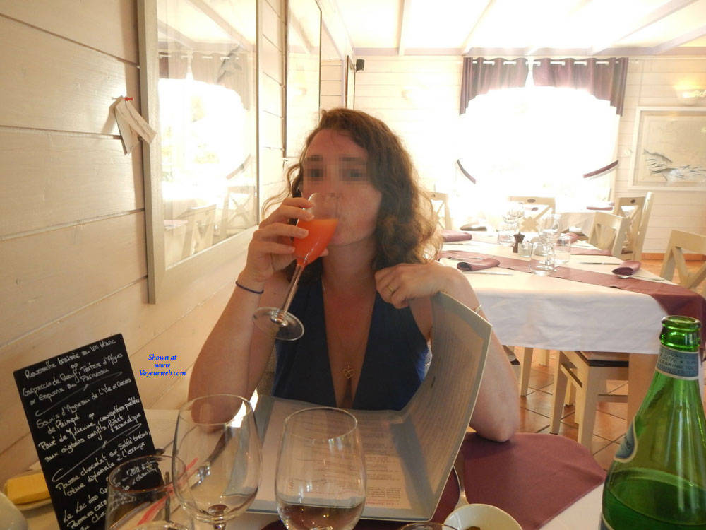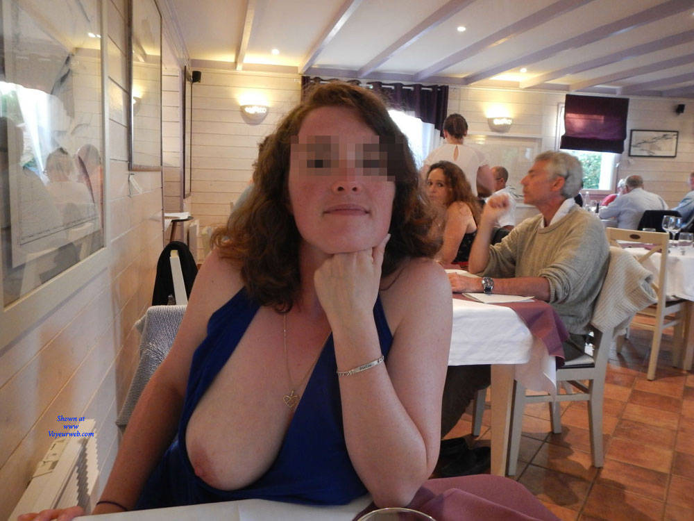 A little flashing at the restaurant full of people in French Britanny with her blue dress bought in Las Vegas last year...