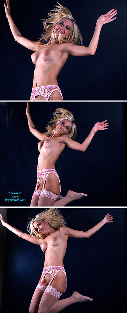 She wanted to have some fun so she started jumping around in her new matching garter belt and stockings.