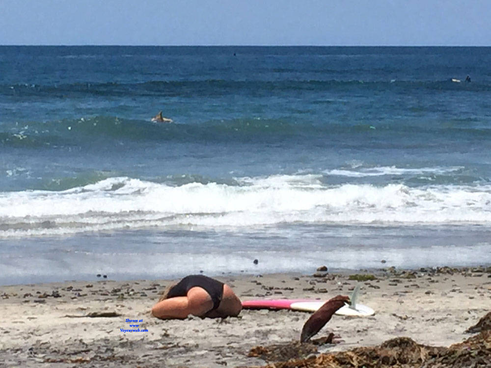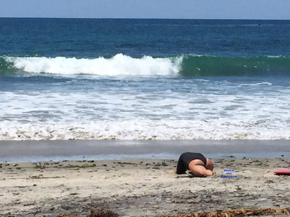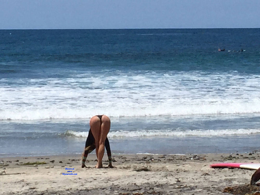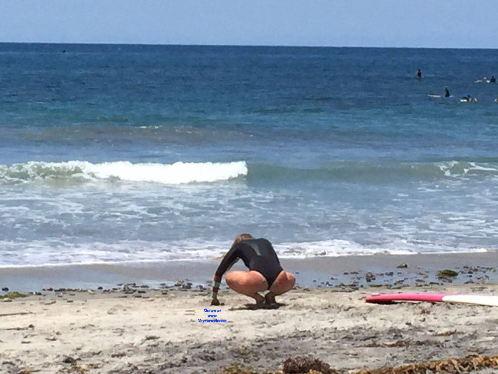 Sexy surfer stretching on beach before catching some waves. All I had was my camera phone, what's more to say.... Just wish she had stripped off her suit to show us more, but the ocean was still too chilly.