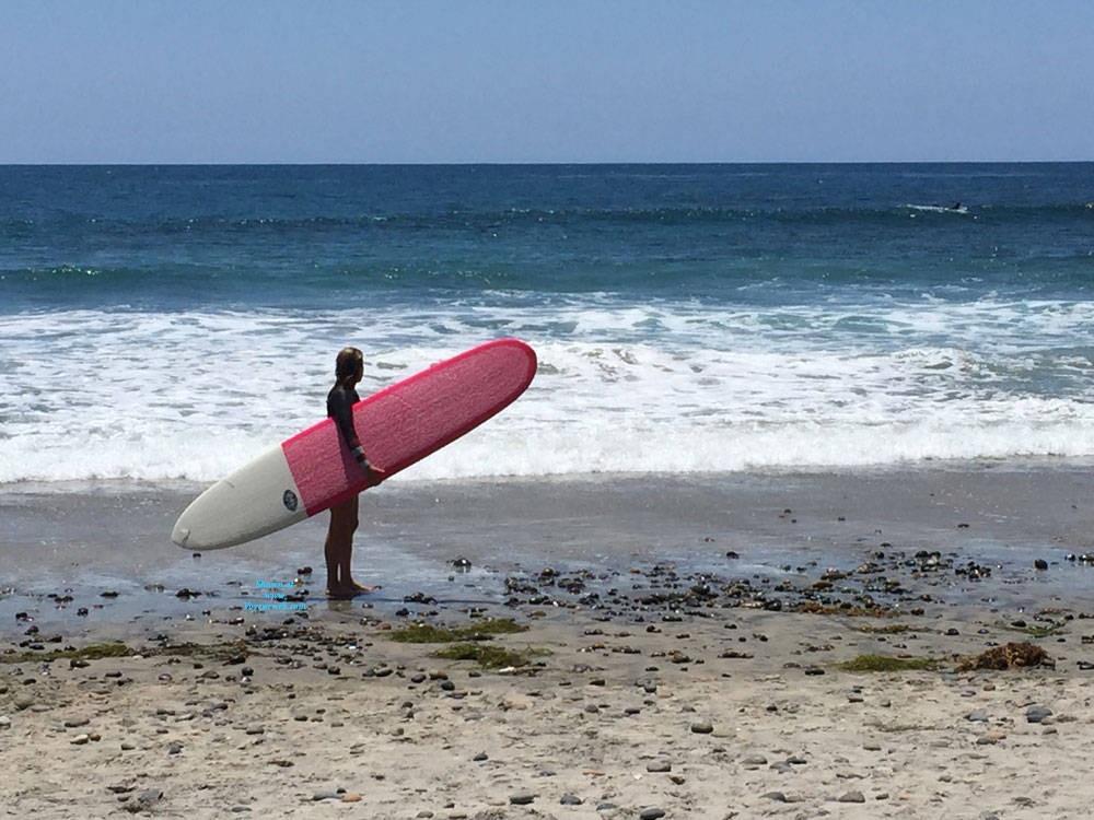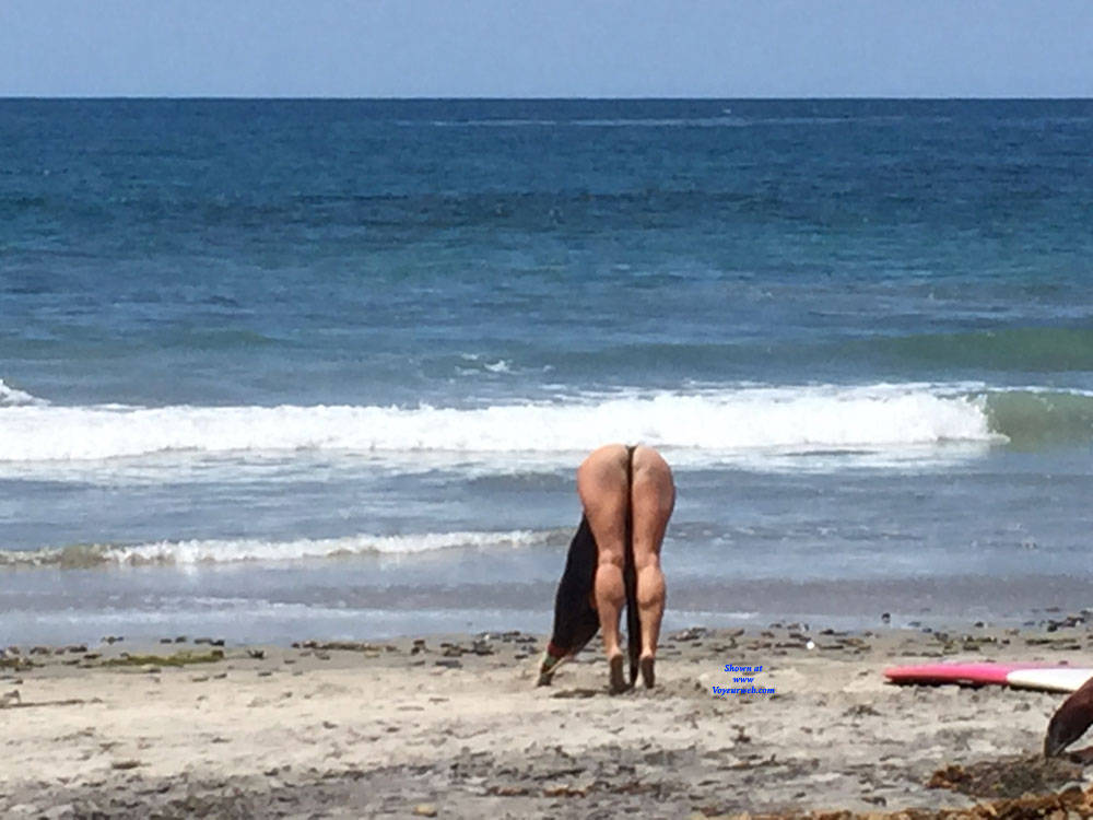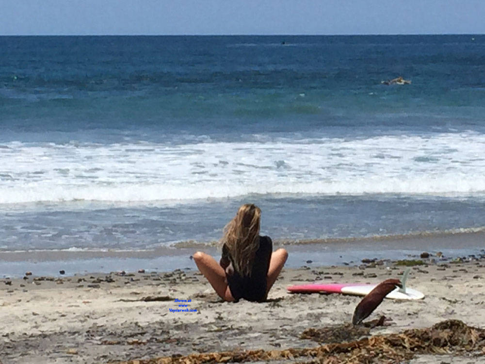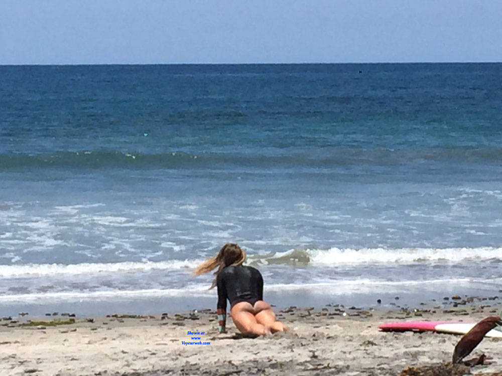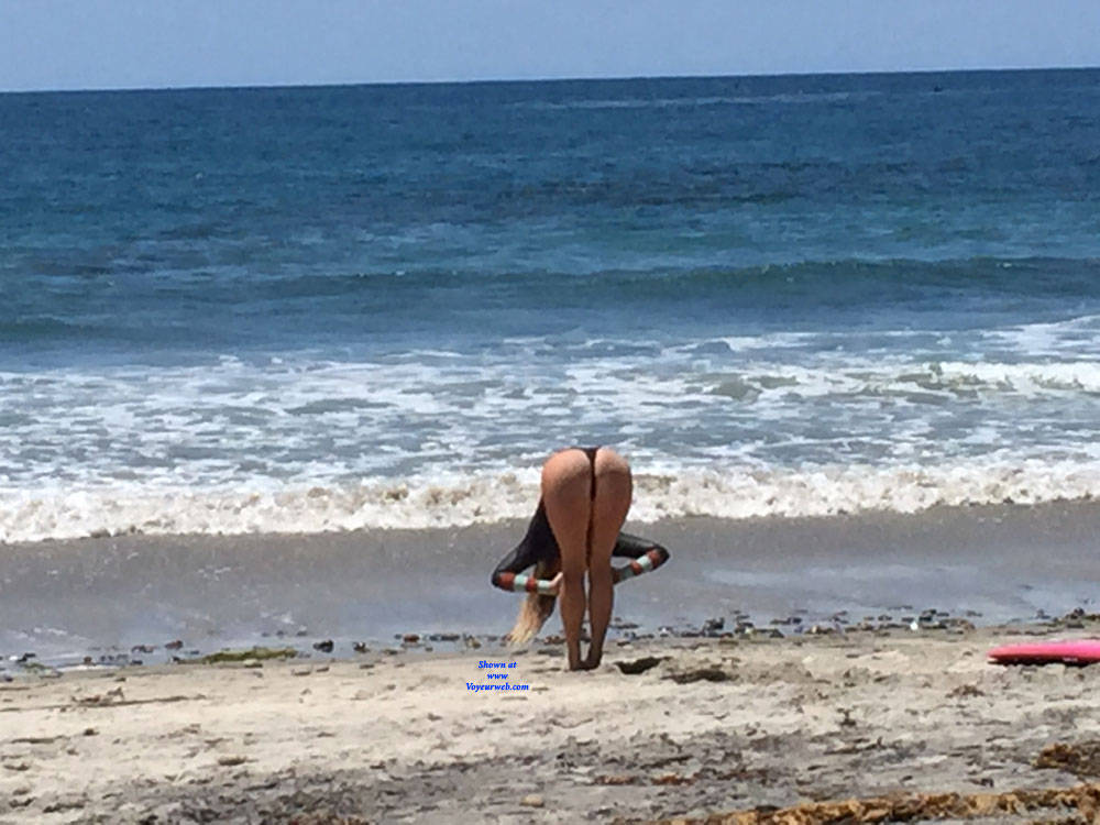 Sexy surfer stretching on beach before catching some waves. All I had was my camera phone, what's more to say.... Just wish she had stripped off her suit to show us more, but the ocean was still too chilly.