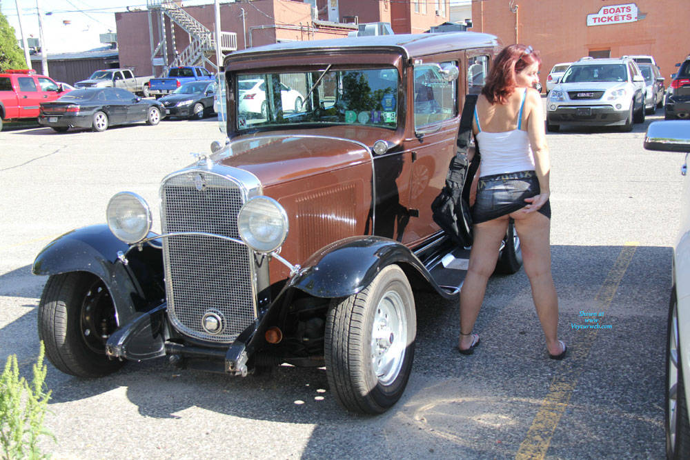 We were in a popular tourist town and they just happened to have a classic car rally driving thru. I was already dressed for fun on the streets, so I thought I would do a little discreet flashing for the camera.