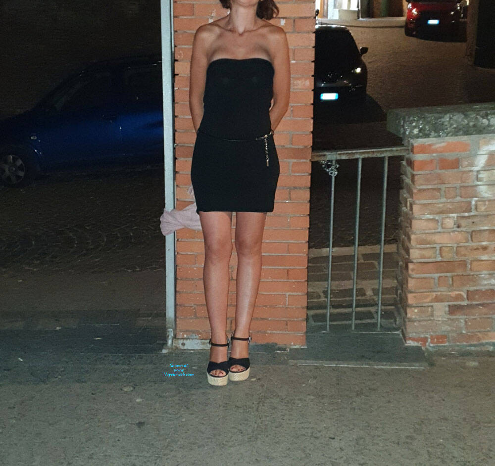 Walking around the city in a black mini dress and ...... nothing else..