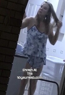 Of course she knows you can see her; that's why she is doing her laundry while naked. Good catch.