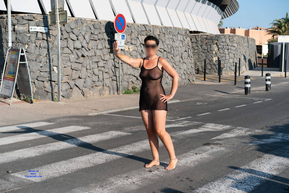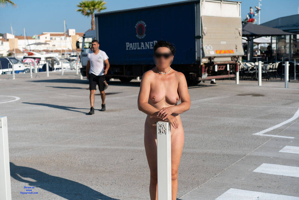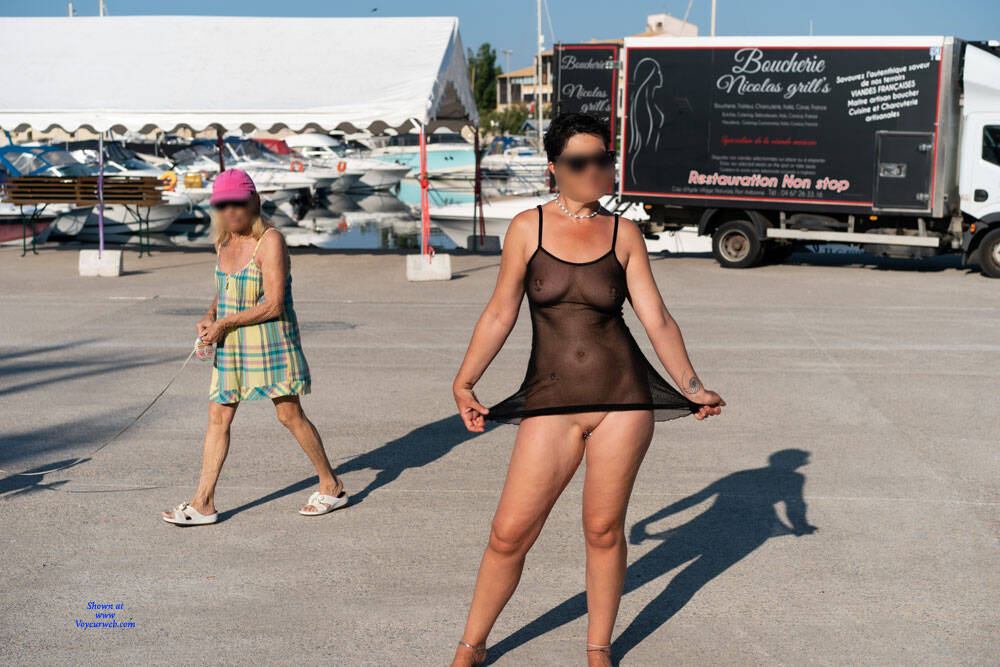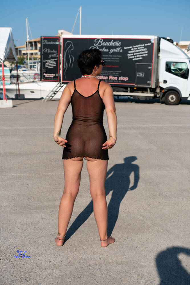 We were on holiday in France this summer and I woke up one morning feeling in a "let's have some fun" mood. I put on a transparent dress over my naked body and off we went for some public photography fun. I didn't wear shoes as I love to be barefoot and wanted to be as naked as I could. We started off with some shots of me in the dress but as my naughtiness kicked in further I pulled the dress down to reveal my tits and then pulled it up to reveal my bald and pierced little cunt before finally taking it off altogether. There were people walking past and when I got fully naked there were delivery drivers around as well. I loved doing this so much that I went out again that night in the same dress and barefoot again to a restaurant and then for a walk around the very busy town. Hope you enjoy the results. If you did please drop me a message x Eve