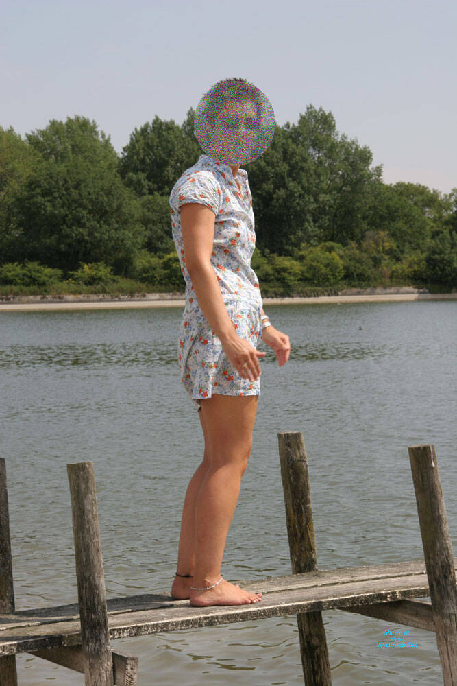 This is another Sunday walk outing with me wearing just my blue summer dress and barefoot all day. For this adventure we chose a local lake that is very popular and is also full of wildlife with a bird hide. I left home in just my dress with no shoes and bare feet and was like that all day. I love being barefoot and Mike loves my feet so we were both happy. We parked the car and started our walk, it wasn't long before we came to the lake with an old rickety boat launch platform. An ideal and very public place to start the fun. Mike got the camera going as I stood on the platform and started to undo my buttons, him keeping an eye out for walkers one way and me the other. Once it was fully unbuttoned I lay down on the deck so he could photograph me in the lovely warm sunshine. I fastened some of the buttons as we carried on with our walk, only so that I could tease him by undoing them again. Once they were unbuttoned for the second time though they stayed like that the rest of the walk. I love having an all over tan and feeling the sun on my body. I didn't take the dress completely off as there were lots of walkers and I had to keep pulling it across my body as we walked by others. They must have had a good idea what we were doing though as Mike had his camera and I was holding my unbuttoned dress across my barefoot body as we walked past. I've been asked for more photos of my feet and bum so have included some here for you. I love reading your comments  so let me know what you think to my latest outing x Eve