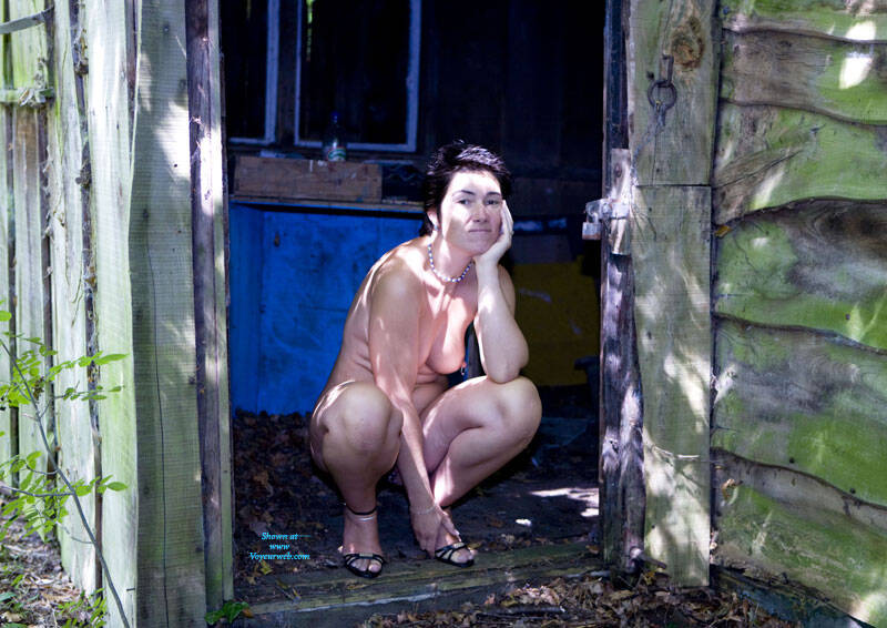 On one or our walks we found this old shack in the woods so decided to return the next day to use it as a backdrop for a sexy outdoor shoot. The next morning I walked through the woods in my red shorts and tie top but I wore sandals until we got there as my heels would have been ruined on the rocky path. The grunginess of the shack was a perfect backdrop to my nudity in front of it. I hope you agree. When we had done with the shack I walked naked through the grass for lots more photos but sadly I've posted my 10 pics for this time so will save those for another gallery. I love reading all your messages xx Eve