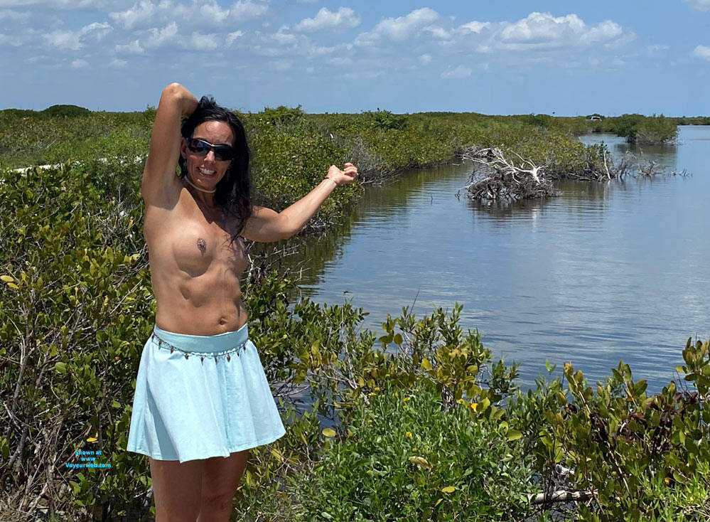 We took a vacation from posting to tend to the family for a while, but we are back! We were at our favorite place for taking pictures, the levees at a certain national seashore. Missy noticed a truck in the background, but kept posting, eventually a different person came up, and rather than covering up, Missy asked him to help us out! In part 2, the stranger becomes a little more intimate...
