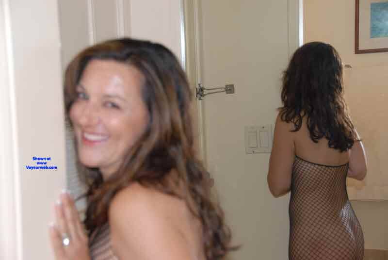 Michelle wearing her fishnet bodysuit on hotel room balcony and bedroom